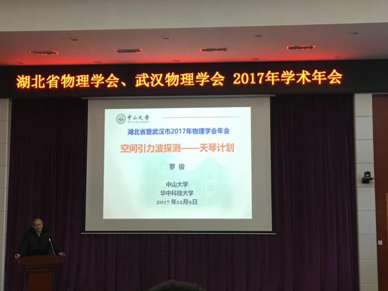 2017年12月9日,湖北省、武汉市湖北省物理学会、武汉物理学会2017年学术年会在武汉大学物理科学与技术学院召开, 中科院武汉分院叶朝辉院士和我中心主任罗俊院士应会议邀请分别作了“我和武汉国家光电实验室”和“空间引力波探测—天琴计划”的邀请报告,邀请报告由武汉大学徐红星院士主持。