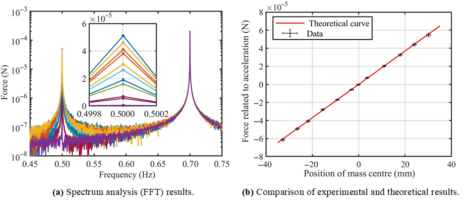 该研究提出质心匹配的方案,通过减小振动等效惯性力的力臂来降低地面振动的影响。双频调制实验的结果显示质心越靠近摆点,地面振动的影响越小。悬摆中的高刚度簧片既提高了系统带宽,也能用于电气连接以避免线缆扰动力。在调节质心接近摆点后,测试系统本底噪声优于0.1 μN/Hz0.5@6mHz~20Hz,满足微推力测试精度需求。