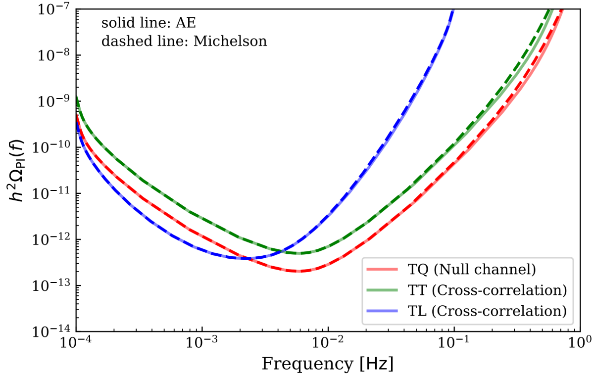最近,胡一鸣副教授团队以天琴、LISA等空间探测器为研究对象,分别针对单探测器独立探测和多探测器组网联合探测两种模式,比较了等臂长迈克尔逊和TDI迈克尔逊对随机引力波背景的探测能力。该工作在不采用任何近似条件的情况下,首次对TDI迈克尔逊下的引力波关联响应进行了严格推导,计算了TDI迈克尔逊的探测灵敏度。在高频处,由于长波近似失效,干涉点空间位置引起的相位差不可忽略,本工作在TDI通道下首次推导了干涉点的空间位置。分析表明,在探测灵敏度最好的频段(1 mHz-0.1 Hz),等臂长迈克尔逊与TDI迈克尔逊的探测能力无明显差异,二者在探测随机引力波背景方面具备良好的等价性。