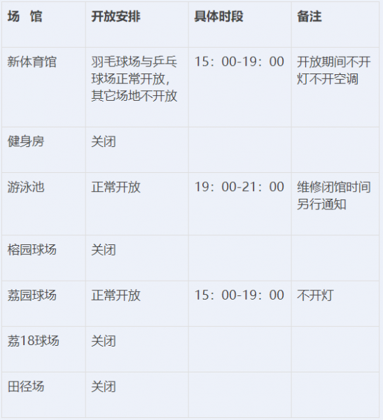 暑假期间(2018年7月19日至8月27日)体育场馆开放计划如下表,8月28日恢复正常开放。