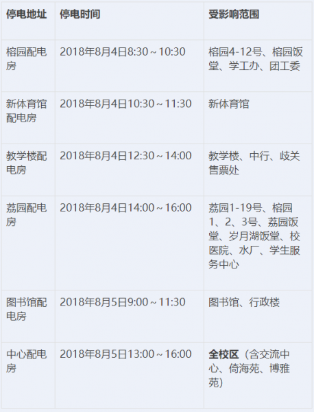 停电期间除饭堂发电正常营业外,其它用户请做好停电准备工作。