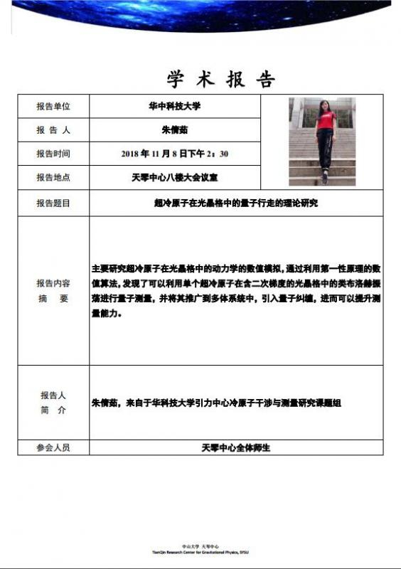 [11月8日学术报告]朱倩茹-超冷原子在光晶格中的量子行走的理论研究