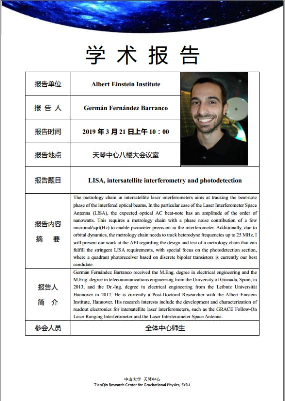[3月21日学术报告]G.F.Barranco-LISA, intersatellite interferometry and photodetection