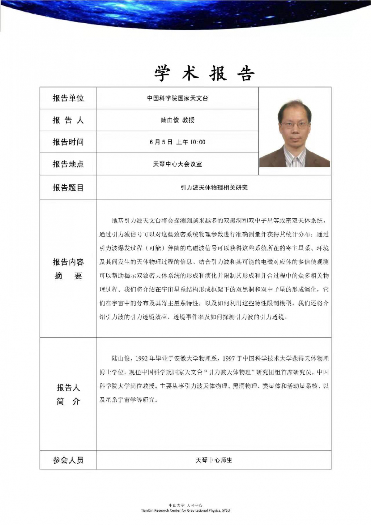 [6月5日学术报告]陆由俊-引力波天体物理相关研究