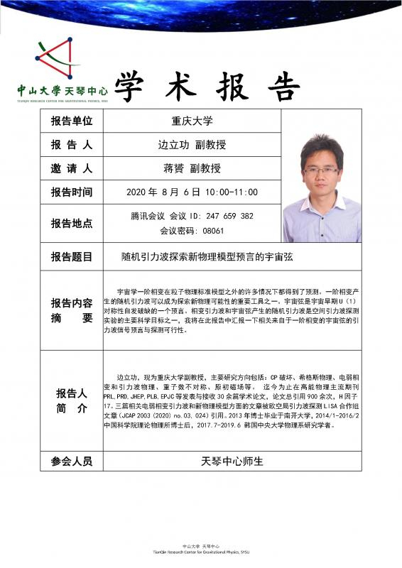 [8月6日学术报告]边立功-随机引力波探索新物理模型预言的宇宙弦