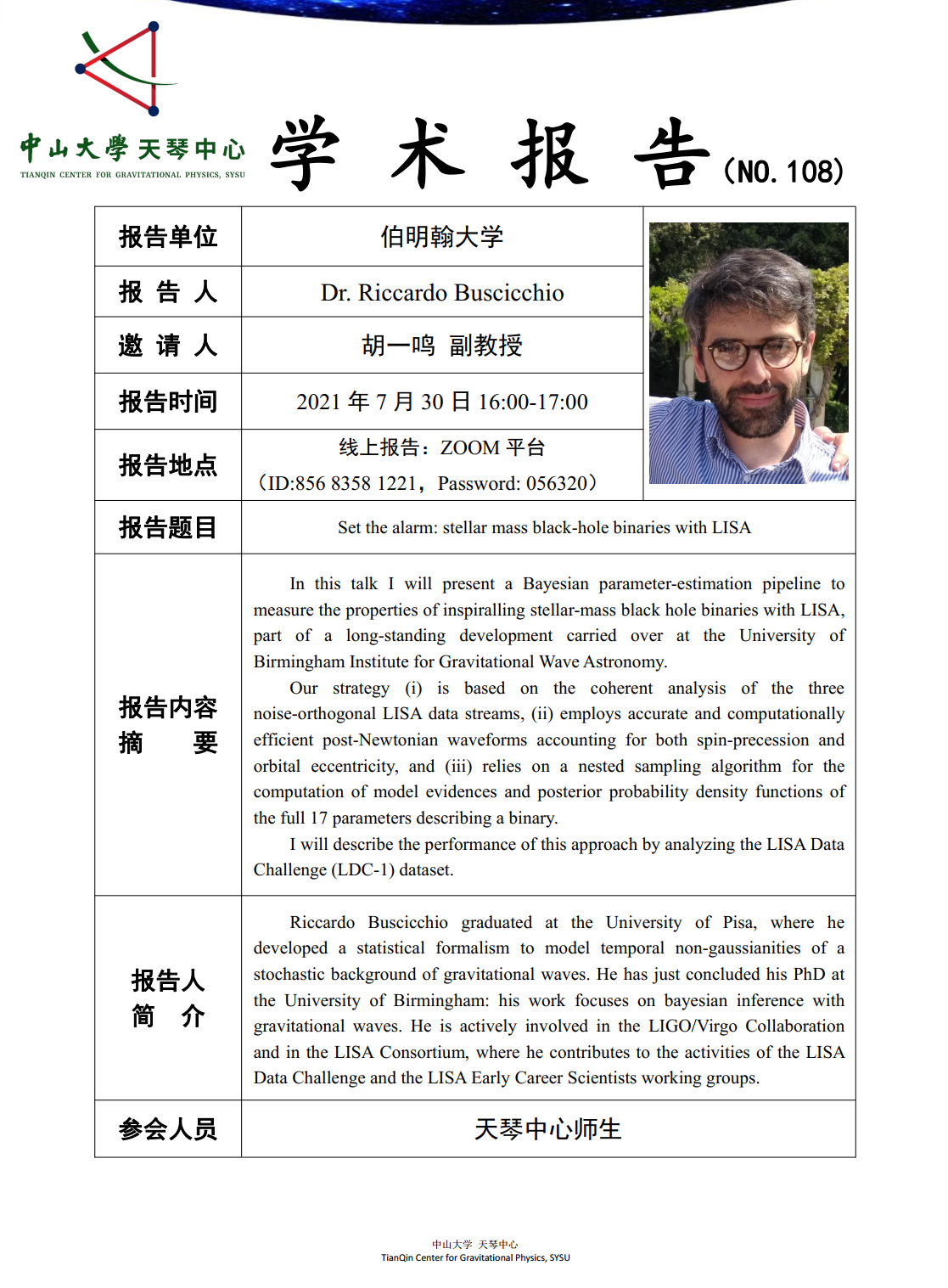 [7月30日学术报告]Dr. Riccardo Buscicchio-Set the alarm: stellar mass black-hole binaries with LISA