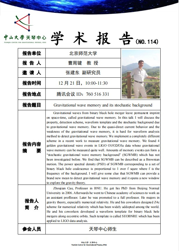 [12月21日学术报告]曹周键-Gravitational wave memory and its stochastic background
