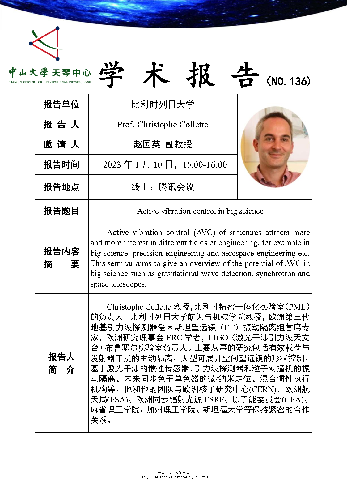 [1月10日学术报告]Christophe Collette-Active vibration control in big science