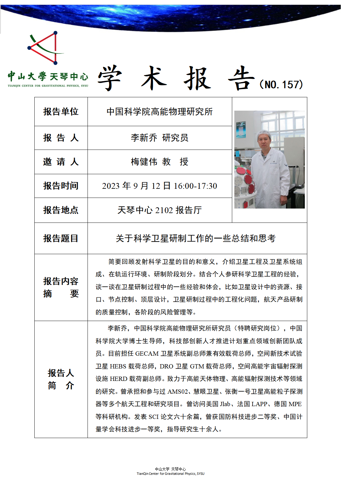 [9月12日学术报告]李新乔-关于科学卫星研制工作的一些总结和思考